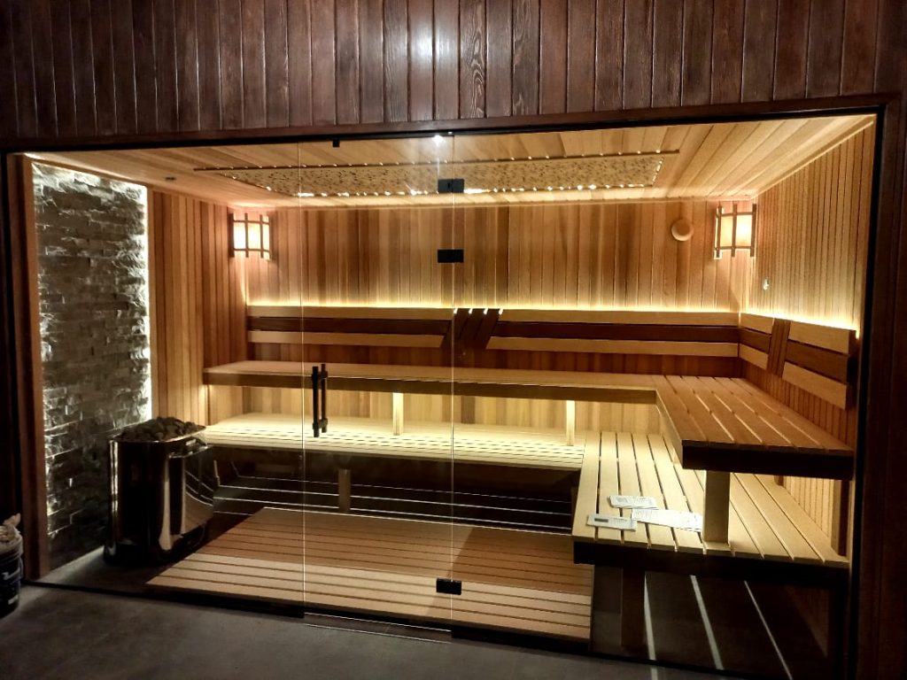 - Eine klassische finnische Sauna aus hochwertigem Holz, die nach Wald und Natur riecht.